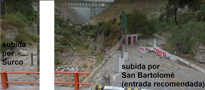 ACCESO : Km 60 de la Carretera Central. Aqui esta el acceso a la Quebrada Verrugas y al Puente Carrión. la Margen Derecha corresponde al distrito de San Bartolomé y la margen Izquierda al distrito de San Jerónimo de Surco. Nosotros recomendamos igual ingresar por la Margen Izquierda pues tiene los mejores caminos.