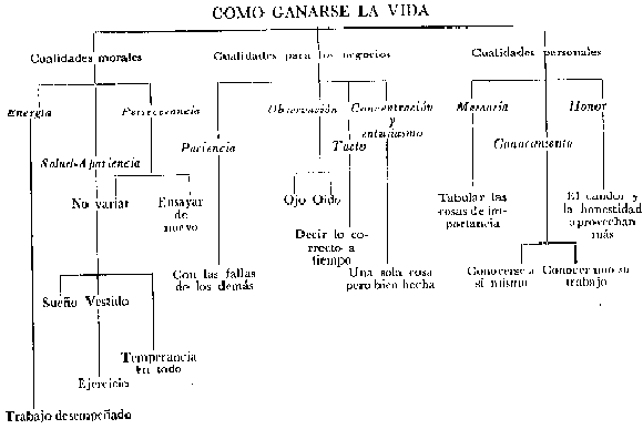 Sería mejor para ellos el mirar a su alrededor en qué lugar del esquema caben; si vieran a lo lejos y se dieran cuenta del valor que al final pudiera tener para ellos en la práctica, fuera de las paredes de la oficina o del taller. Los mejores trabajadores como los hombres más felices, ven en su trabajo una especie de juego que entre más fervor pongan al practicarlo más agradable se torna. H. G. Wells escribía a la Conferencia de Paises de Washington diciendo: "He notado que los llamados grandes hombres no son en su corazón sino muchachos, por el ansia con que gozan de su trabajo. Trabajan porque les gusta el trabajo y así se convierte éste para ellos en un juego. El muchacho no es solamente el futuro padre del hombre sino que es un hombre que jamás desaparece." Ralph Parlette decía con verdad: "Jugar es hacer las cosas con amor. Trabajar es tener que hacer las cosas". En las cosas existe mucho de indispensable. Se me preguntó una vez por qué admiraba yo tanto a mi sirviente indio. La razón era muy sencilla, porque él siempre ponía a su patrón primero y a su persona después, si es que alguna vez se ocupaba de su persona, siempre estaba en su puesto listo para cualquier trabajo, callado y muy resistente. Era un tesoro. Pero en aquel país una persona como ésta no era excepcional aún cuando tal vez sí en otras partes. Sin saberlo, era indispensable y yo puedo deciros esto: que si os hacéis indispensables a vuestros patrones no van a deshacerse de vosotros con prisa a pesar de lo que les cueste. Otro punto que va en la lista anterior, es la de ejecutar el trabajo con rapidez. Puede ser que esto caiga bajo el título de energía, pero se mejora mucho con la práctica. Si vosotros sóis rápidos en vuestro juego, y en vuestras acciones personales a tal punto que ésto se convierta en un hábito, vosotros seréis también rápidos en vuestro trabajo y eso contará a vuestro favor. Como práctica ensayadlo al vestiros diariamente. No perdáis el tiempo, poned todo en su lugar y a mano, contáos el tiempo y tratad de mejorar vuestro propio récord. Otros puntos de los que se encuentran en la lista que merecen especial atención y generalmente reciben muy poco, son: aplomo y alegría. Existe otra cosa que debéis considerar como una adquisición necesaria para vuestra carrera y es: esperanza. No penséis que porque principáis muy abajo será imposible ascender. Muchos de los hombres más grandes del día comenzaron en lo más bajo de la escala. Pero como ya he dicho antes, vosotros tendréis que hacer el ascenso por vuestro propio esfuerzo. No os quedéis en el lodo porque ya hay otros ahí. Buscad las piedras que os pueden ayudar a salir de él y utilizadlas. Poned vuestro pie en el escalón más bajo y principiad a ascender. He visto a muchas personas comenzar muy arriba en la vida, provistas de todo lo necesario para tener éxito, y que más tarde descendieron por falta de paciencia. Cuando las cosas se les pusieron en contra, inmediatamente abandonaron su empresa para ensayar algo nuevo, y una vez que se cae en el hábito de abandonar una cosa y ensayar otra distinta, ese hábito es difícil de quitar y la vida toda se convierte en una serie de fracasos y de nuevos ensayos. Por lo que respecta a la Parte II del diagrama, la cuestión de cómo vivir, es decir cómo gozar de la vida con verdadera felicidad y no mero placer, es de igual importancia que el problema de cómo ganarse la vida y las dos partes en que lo he dividido son casi de igual importancia una con respecto a la otra: tener altos ideales y servir al prójimo. Pero creo que el servicio al prójimo es el más importante de los dos. porque también incluye un elevado ideal y es el escalón principal para obtener la felicidad. Es por esto que volveré a tratarlo con mayor amplitud en otro capítulo. SENTIDO COMÚN Cuando la codicia sienta sus reales, la honestidad desaparece. Más vale pájaro en mano que ciento volando. Más vale un peso en la mano que dos en un billete de lotería. Sí en vuestra profesión no os adaptáis, no paréis hasta conseguirlo. Un asunto, como una prenda de ropa, tiene siempre dos vistas y hay que ver las dos antes de formarse una opinión. ¿Como convertir el trabajo en placer?: el placer consiste amar el trabajo. No puede haber placer en un trabajo que se hace con fastidio (R. Parlette). Hay que vivir de tal manera que, cuando uno muera todo el mundo lo lamente, aún el dueño de la agencia funeraria. (Mark Twain). La felicidad consiste en adaptarse a sus medios (Artemus Ward). La mayor parte del vicio viene de evitar la transpiración (Dr. W. J. Dawson). Autorreverencia, conocimiento de sí mismo, control de sí mismo, he ahí tres fuerzas que conducen a una vida de poder omnímodo (Tennyson). SONREIR SIEMPRE El que es capaz de dominarse hasta sonreír en la mayor de sus dificultades, es el que ha llegado a poseer la sabiduría de la vida. LIBROS ÚTILES QUE LEER The Facts of Gambling. G. M. Hooge (Hutchinson). Money. H. Withers (Benns Lihrary). First Steps to Climbing. G. D. Abrahams (Milis & Boon). Mountain Craft. G. W. Young (Methuen). Normas de campamento. (Editorial Escultismo). Introducción a las aves de América. (Editorial Escultismo). Campamentos organizados. (Editorial Escultismo): Manual del Guía de Patrulla. (Editorial Escultismo). Escalada. E. Mallafré. (Editorial Juventud). ESCOLLO NÚMERO DOS VINO El lado sombrío de este escollo es la tentación de acabar con la propia felicidad por darse gusto a uno mismo. El lado luminoso es el hecho de que, sobreponiéndose al propio deseo, se fortalece el carácter y se le da un gozo más elevado a la propia vida. Condescendencia. La copa entre comidas es un lujo peligroso. La tentación de condescender con un amigo, es el primer paso para la bebida. El borrachín solitario se convierte en un disipador. Los borrachos son un peligro para el Estado. La prohibición no es necesaria en un país cuyos hombres tienen carácter. L