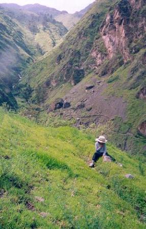 ![]() Damir En ub desvìo. Al fondo se ve el estremo de la querada de Ucchumayo. A la derecha arriba se ve la formación rocosa que crea el efecto del Rostro de cristo, aunque para apreciarlo falta aun acercarnos |